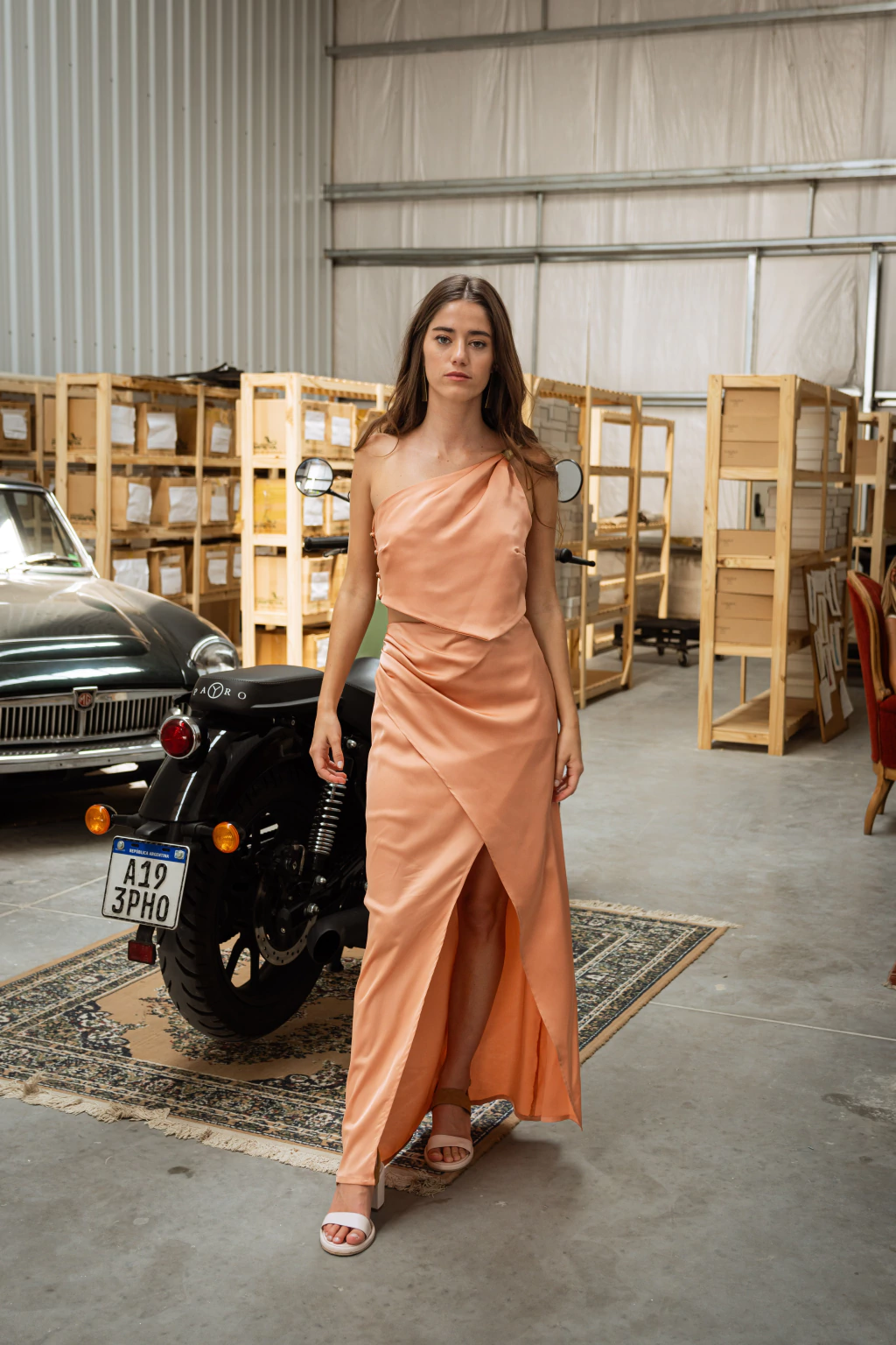 El conjunto presenta un look sofisticado y sensual gracias al brillo del satén, pero a su vez habla de alguién que le gusta el diseño y un estilo más descontracturado y no tan tradicional. Lleva como primer pieza, un top de estilo romano con una charretera en forma de tubo de alpaca o de bronce, diseñada junto a concepto c joyas, que corona el hombro y genera un frunce sobre el satén que es perfecto para realzar su brillo. Además el corte en diagonal del top se unifica perfectamente con la pollera e inmediatamente hace resaltar los puntos fuertes del conjunto. Lo sexy del escote, el drapeado y el cruce de la pollera.
